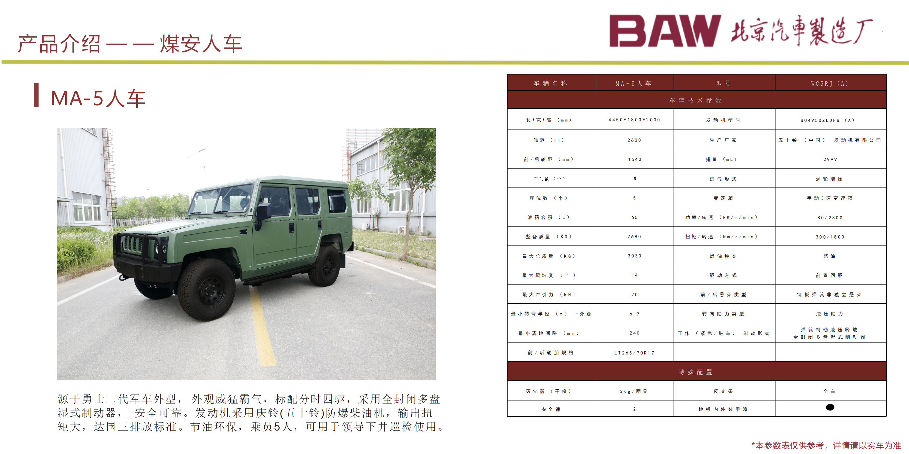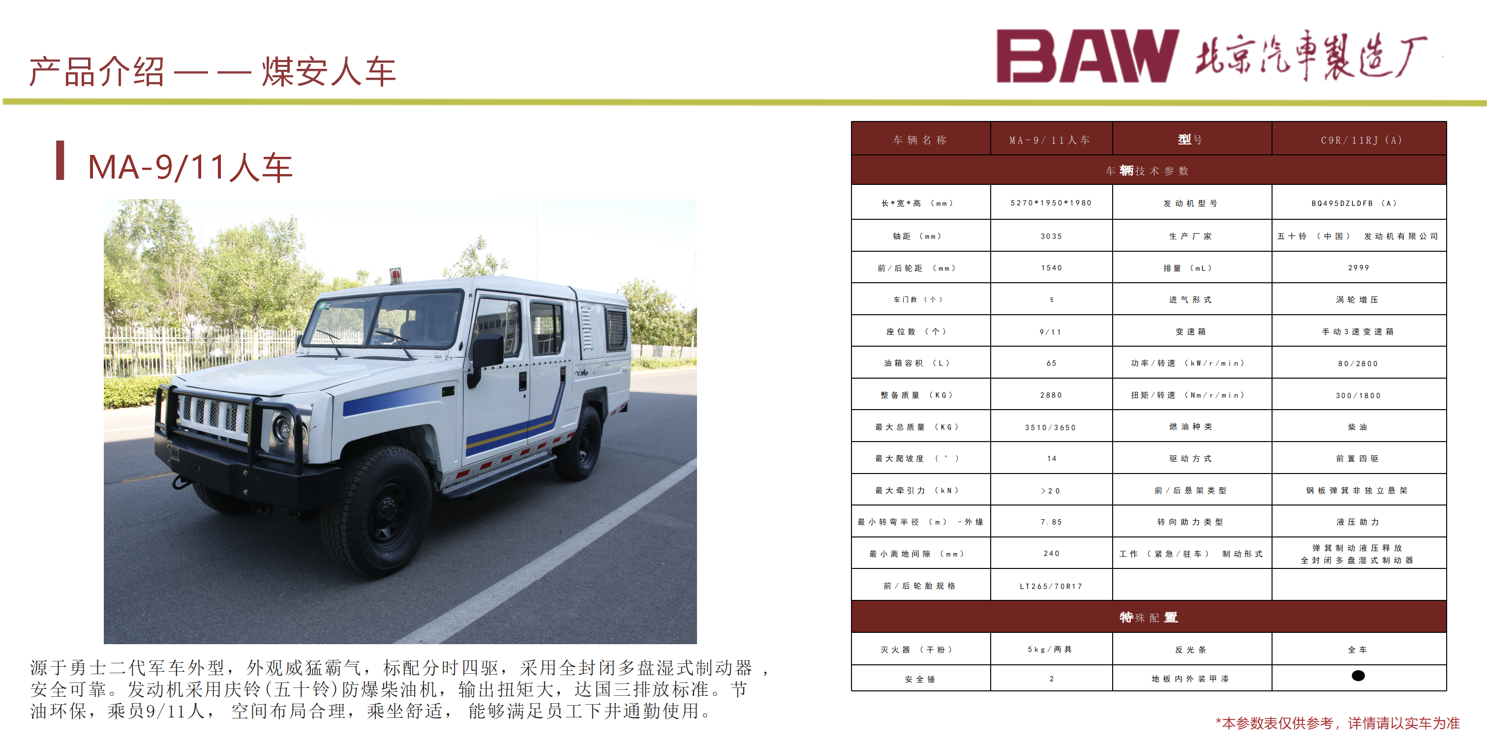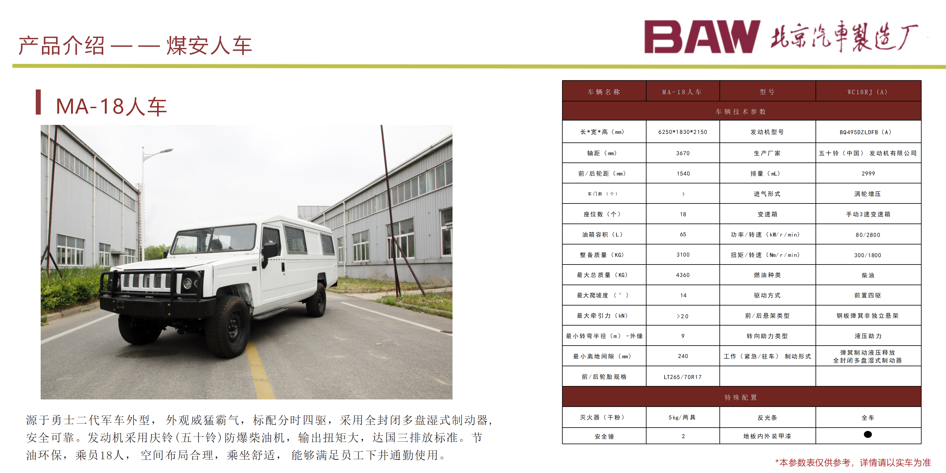 煤安車系列源于勇士二代軍車外型, 外觀威猛霸氣,標(biāo)配分時(shí)四驅(qū),采用全封閉多盤濕式制動器, 安全可靠。發(fā)動機(jī)采用慶鈴(五十鈴)防爆柴油機(jī),輸出扭矩大,達(dá)國三排放標(biāo)準(zhǔn)。節(jié)油環(huán)保, 空間布局合理,乘坐舒適, 能夠滿足員工下井通勤使用。