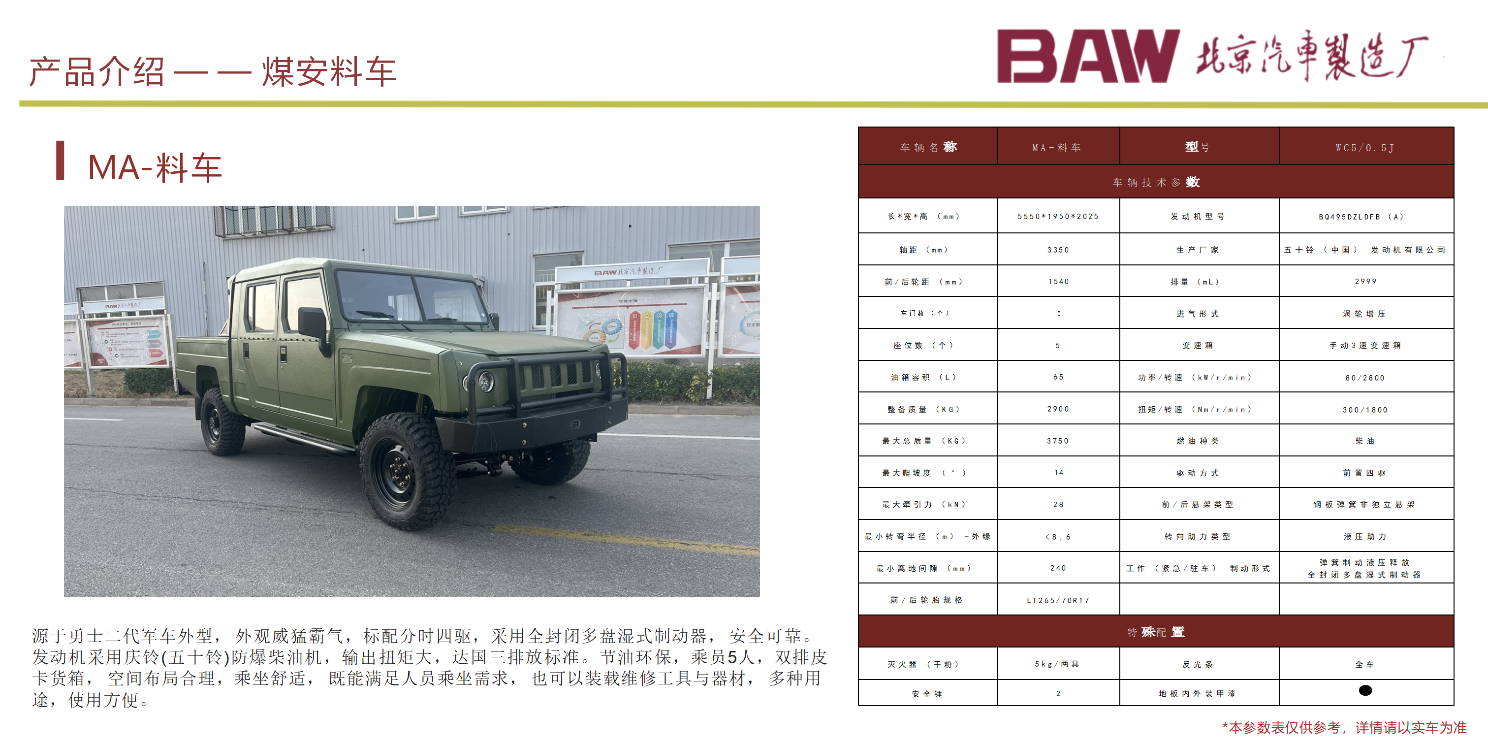煤安車系列源于勇士二代軍車外型, 外觀威猛霸氣,標(biāo)配分時(shí)四驅(qū),采用全封閉多盤濕式制動器, 安全可靠。發(fā)動機(jī)采用慶鈴(五十鈴)防爆柴油機(jī),輸出扭矩大,達(dá)國三排放標(biāo)準(zhǔn)。