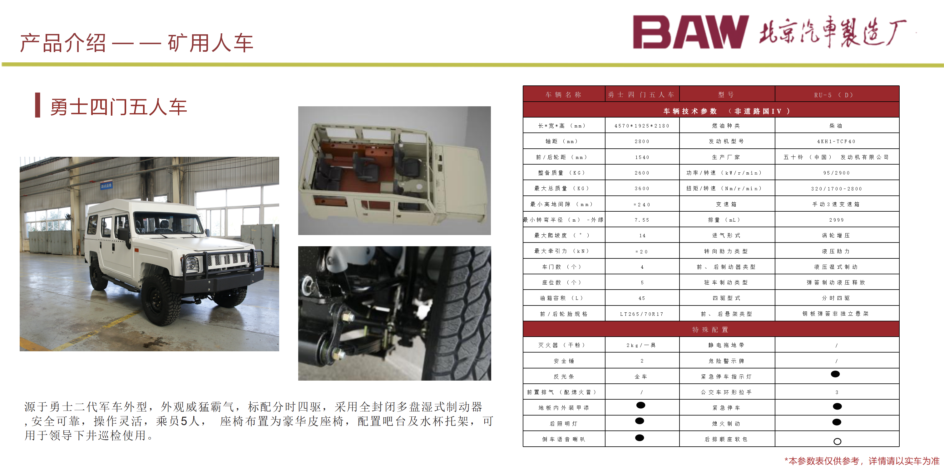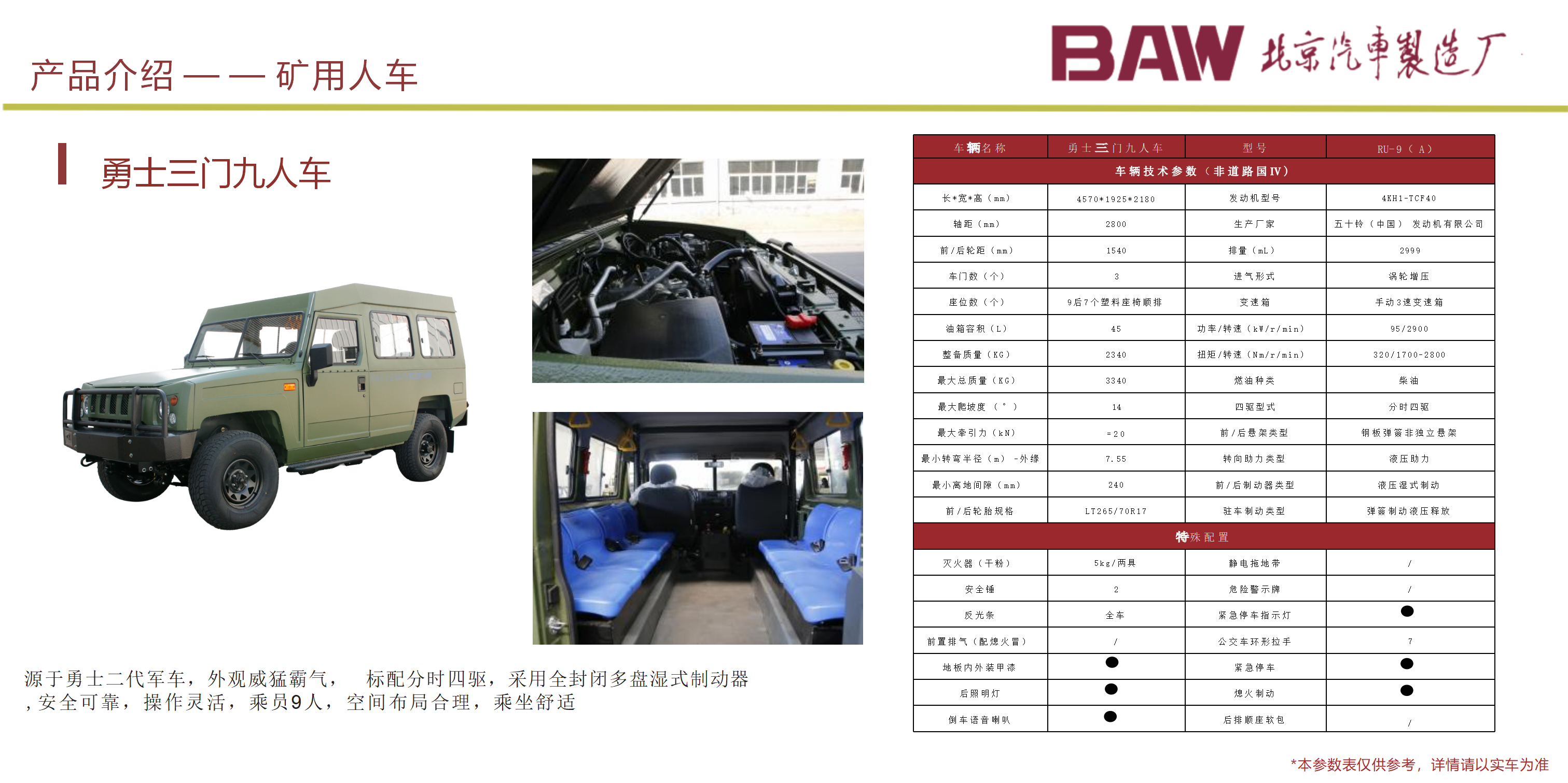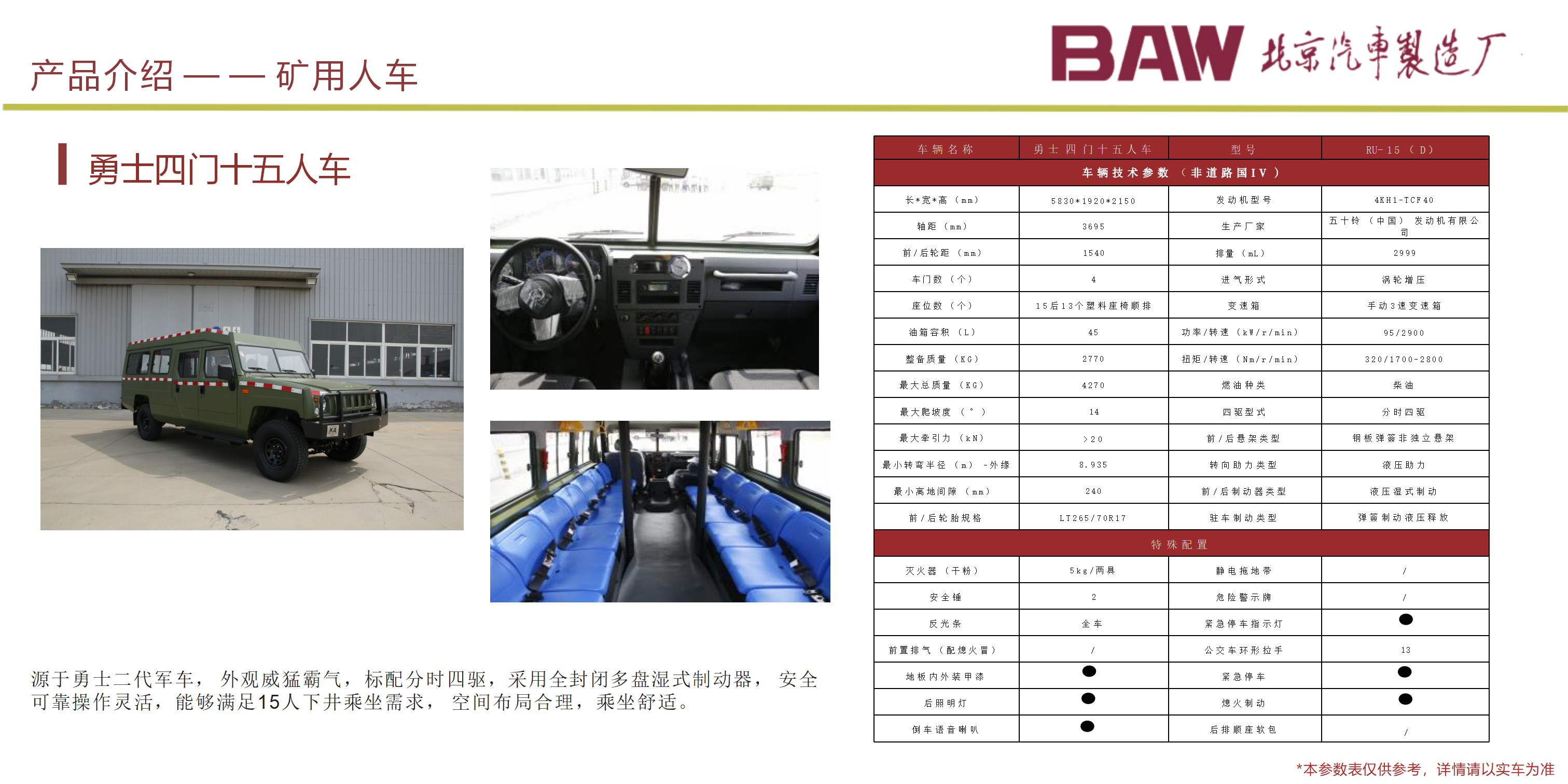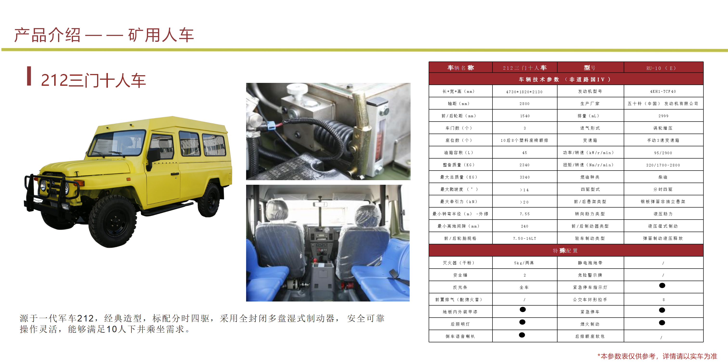 礦安系列車型均符合國家安全法律法規(guī)要求,具備礦安認(rèn)證文件,已開發(fā)及即將開發(fā)的車型有10、15、19人運(yùn)人車輛及材料車、炸藥車等。 配備國三江鈴、玉動(dòng)及國四慶鈴發(fā)動(dòng)機(jī)