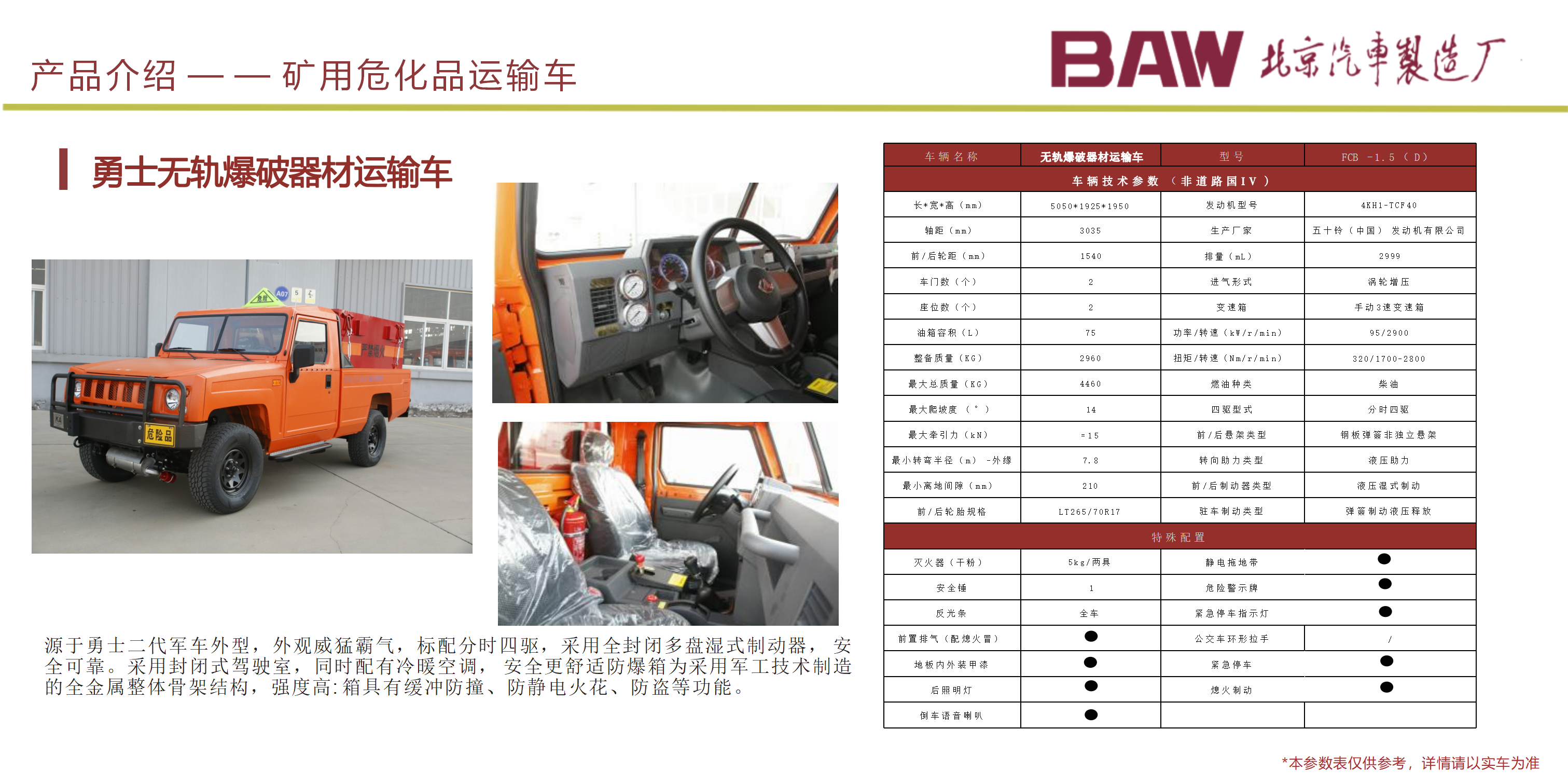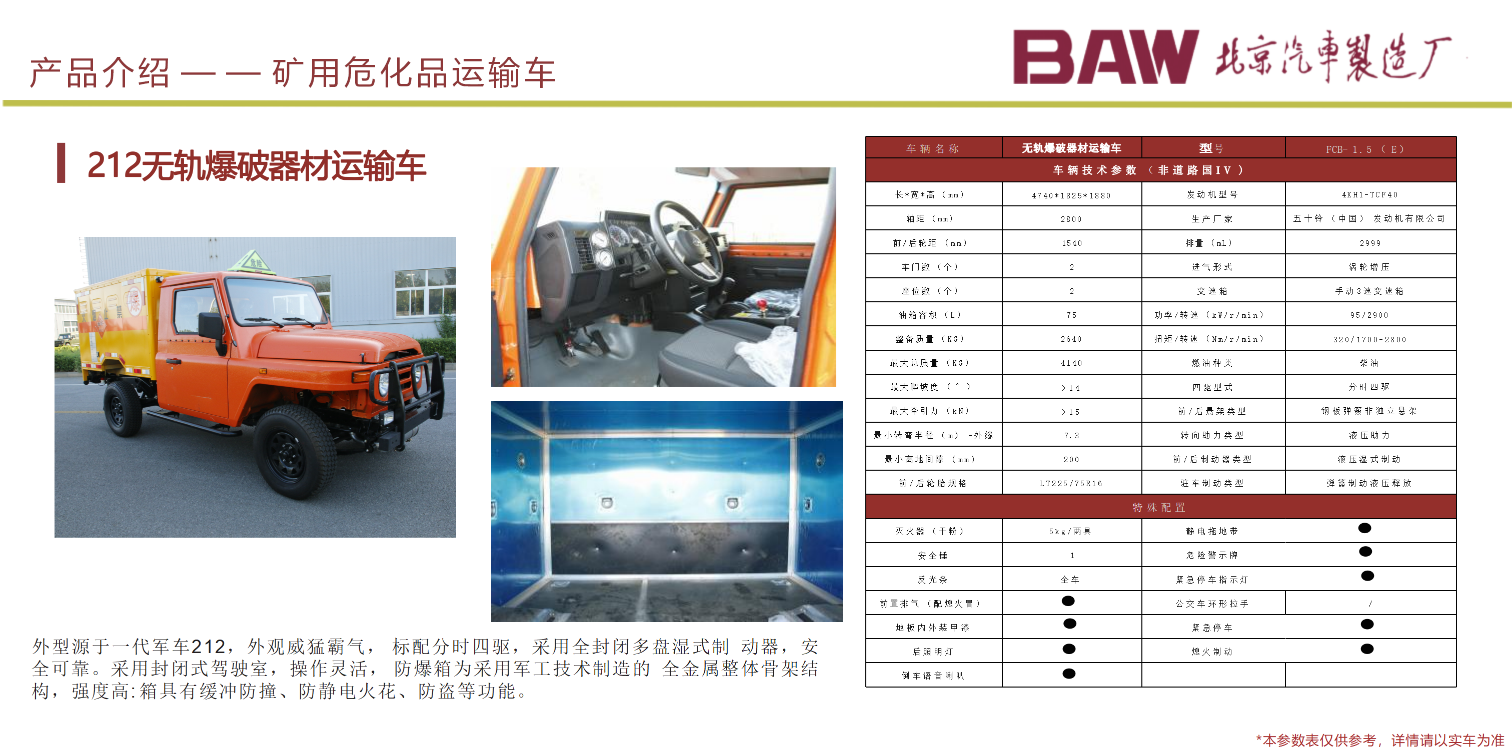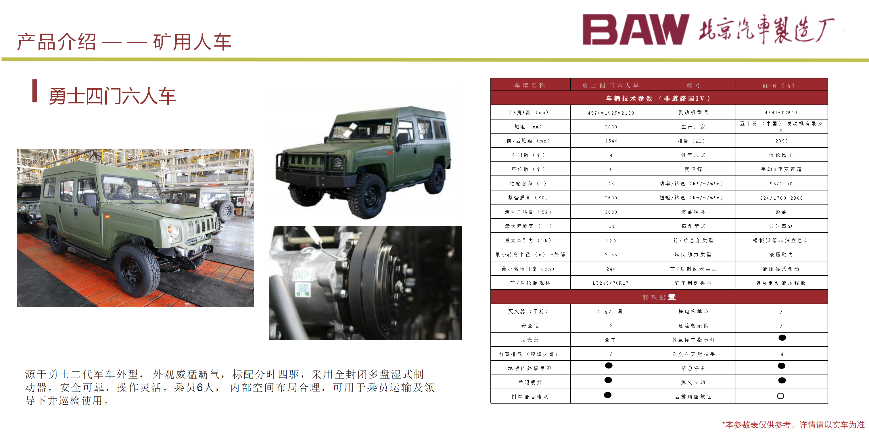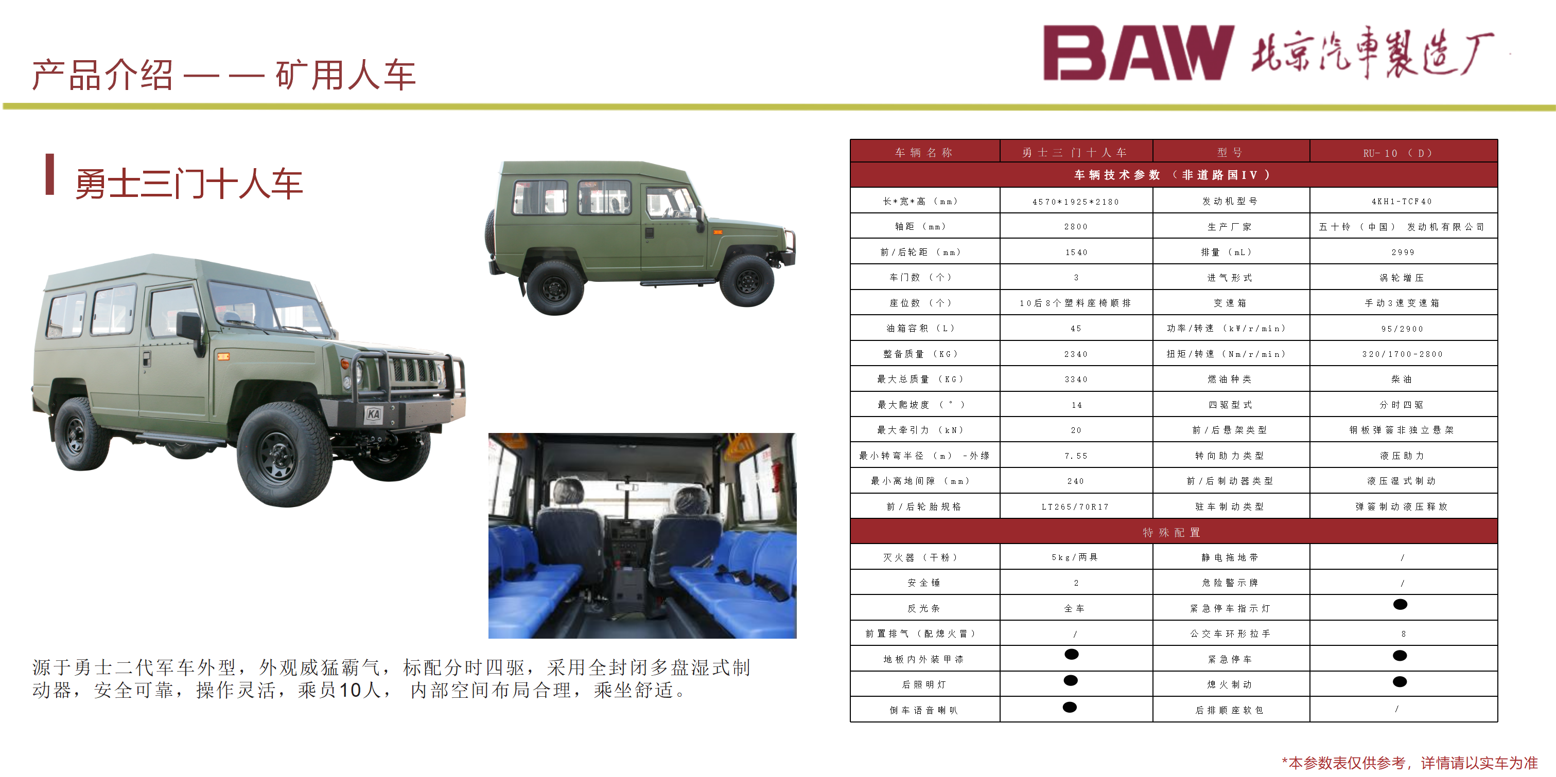 礦安系列車型均符合國家安全法律法規(guī)要求,具備礦安認(rèn)證文件,已開發(fā)及即將開發(fā)的車型有10、15、19人運(yùn)人車輛及材料車、炸藥車等。 配備國三江鈴、玉動(dòng)及國四慶鈴發(fā)動(dòng)機(jī)