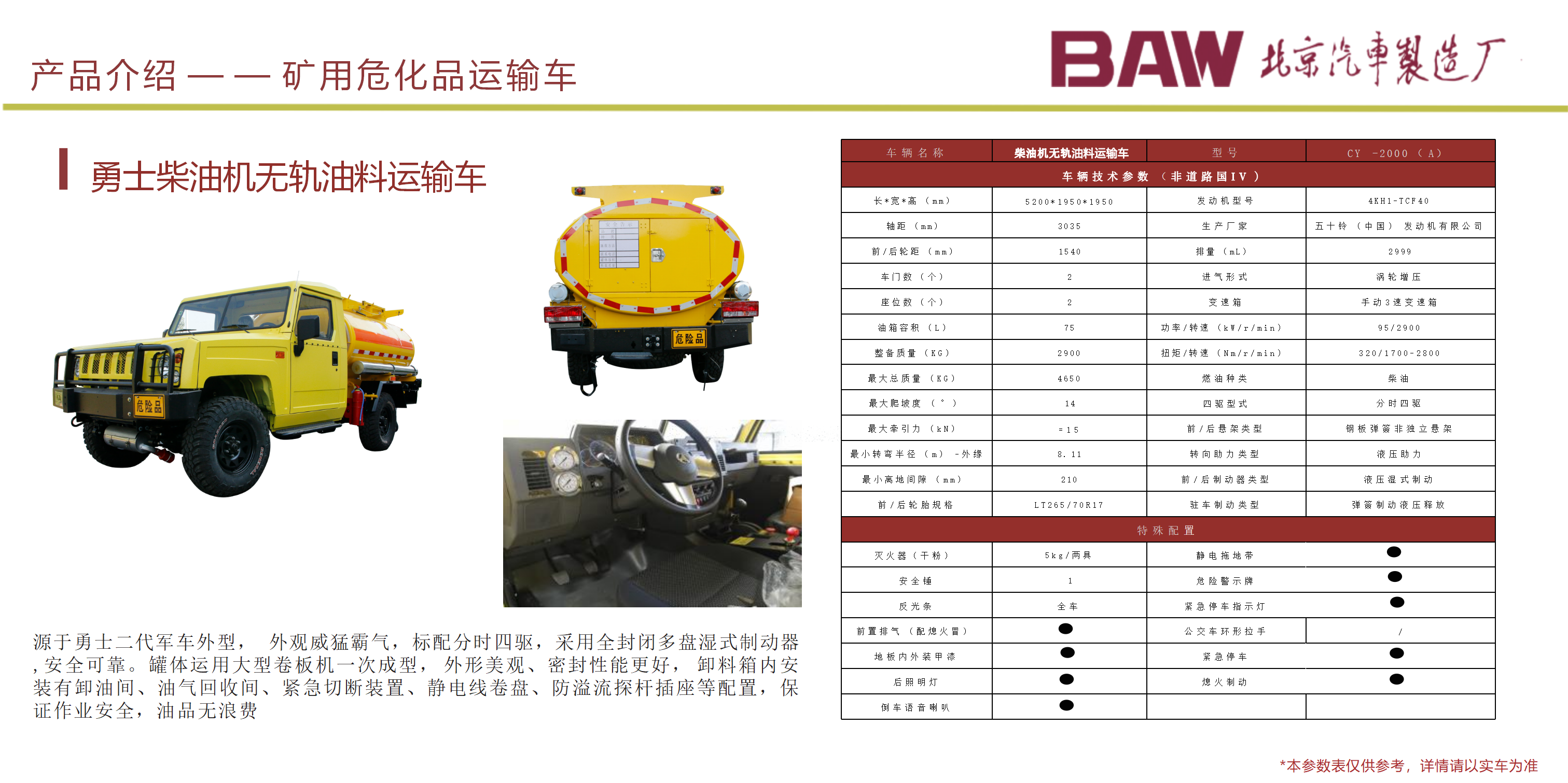 主要用于井下人員的運(yùn)輸 , 以柴油機(jī)為動(dòng)力,適應(yīng)能力強(qiáng); 1、 適用于 3m×3m 巷道斷面的井下運(yùn)輸作業(yè); 2、整車具有耐碰撞性能高、油耗低、綜合運(yùn)行成本低、操作簡單,乘座舒 適,結(jié)構(gòu)合理,維修、保養(yǎng)容易等諸多優(yōu)點(diǎn); 3、主要電器元件如控制器、液壓、傳動(dòng)系統(tǒng)的關(guān)鍵部件均采用國內(nèi)外知名 品牌廠家元件,性能可靠; 4、制動(dòng)系統(tǒng)為濕式制動(dòng),彈簧制動(dòng),液壓釋放,安全性能更高;